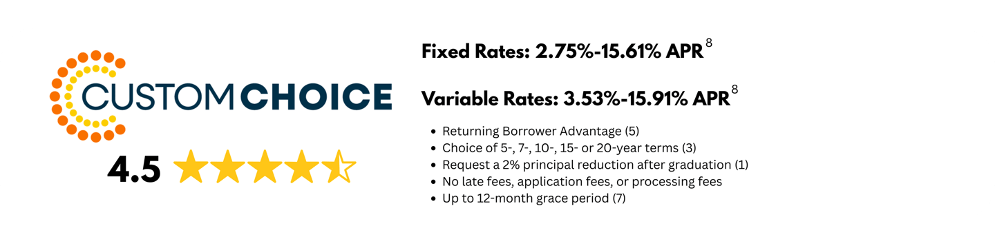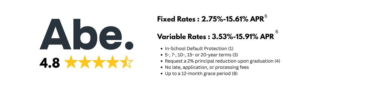 6 Interest rates and APRs (Annual Percentage Rates): Interest rates and APRs (Annual Percentage Rates) depend upon (1) the student’s and cosigner’s (if applicable) credit histories, (2) the repayment option and repayment term selected, (3) the expected number of years in deferment, (4) the requested loan amount and (5) other information provided on the online loan application. Rates and terms are effective as of 02/01/2026. The variable interest rate for each calendar month is calculated by adding the 30-Day Average Secured Overnight Financing Rate (“SOFR”) index, plus a fixed margin assigned to each loan. The current SOFR index, published on the website of the Federal Reserve Bank of New York, is 3.65% as of 02/01/2026. The applicable index or margin for variable rate loans may change over time and result in a different APR than shown. The fixed rate assigned to a loan will never change except as required by law or if you request and qualify for an interest rate discount or receive In-School Default Protection (see footnote #1 for details). APRs displayed as a range: APRs assume a $10,000 loan with one disbursement. The high APRs assume a 5-year term with the Interest-Only Repayment option, a 31-month deferment period, and a six-month grace period before entering repayment. The low APRs assume a 7-year term, and the Interest-Only Repayment option with payments beginning 30-60 days after the disbursement via auto pay (see footnote #9 for details).