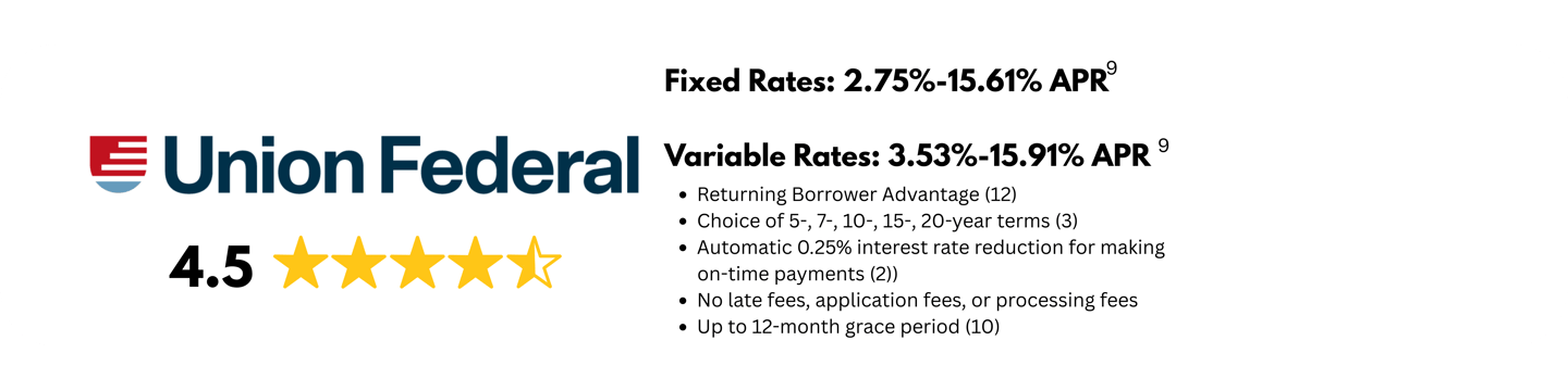 The Union Federal® Private Student Loan is made by DR Bank, member FDIC (“Lender”). All loans are subject to individual approval and adherence to Lender’s underwriting guidelines. Program restrictions and other terms and conditions apply. LENDER AND MONOGRAM LLC EACH RESERVES THE RIGHT TO MODIFY OR DISCONTINUE PRODUCTS AND BENEFITS AT ANY TIME WITHOUT NOTICE. TERMS, CONDITIONS AND RATES ARE SUBJECT TO CHANGE AT ANY TIME WITHOUT NOTICE.