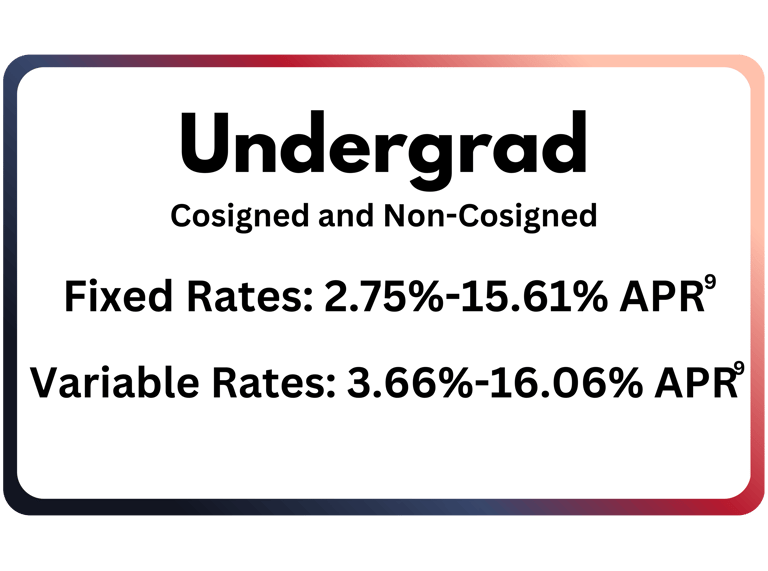 (9) Interest rates and APRs (Annual Percentage Rates) depend upon (1) the student’s and cosigner’s (if applicable) credit histories, (2) the repayment option and repayment term selected, (3) the expected number of years in deferment, (4) the requested loan amount and (5) other information provided on the online loan application Rates and terms are effective as of 1/1/26.The variable interest rate for each calendar month is calculated by adding the 30-Day Average Secured Overnight Financing Rate (“SOFR”) index plus a fixed margin assigned to each loan. The current SOFR index, published on the website of the Federal Reserve Bank of New York, is 3.875% as of 1/1/26. The applicable index or margin for variable rate loans may change over time and result in a different APR than shown. The fixed rate assigned to a loan will never change except as required by law or if you request and qualify for an interest rate discount or receive In-School Default Protection (see footnote #14 for details). APRs assume a $10,000 loan with one disbursement. The high APRs assume a 5-year term with the Interest-Only Repayment option, a 31-month deferment period, and a six-month grace period before entering repayment. The low APRs assume a 7-year term, and the Interest-Only option with payments beginning 30-60 days after the disbursement via auto pay. See footnote 1 for auto pay details.
