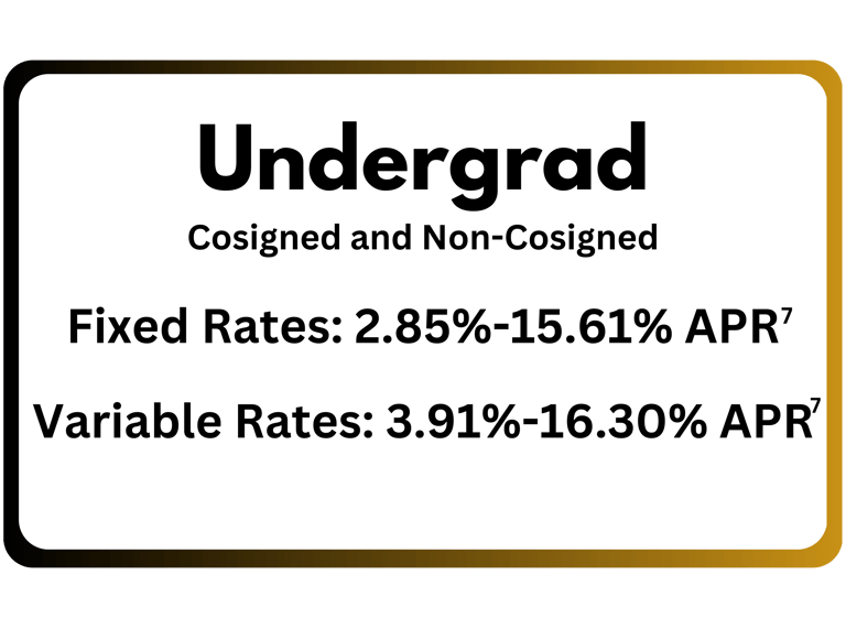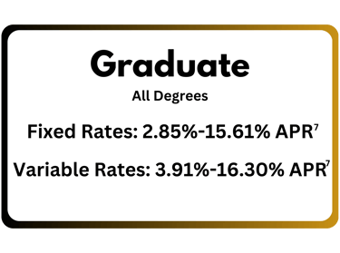 7 Interest rates and APRs (Annual Percentage Rates): Interest rates and APRs (Annual Percentage Rates) depend upon (1) the student’s and cosigner’s (if applicable) credit histories, (2) the repayment option and repayment term selected, (3) the expected number of years in deferment, (4) the requested loan amount and (5) other information provided on the online loan application. If approved, applicants will be notified of the rate applicable to your loan. Rates and terms are effective as of 12/1/2025. The variable interest rate for each calendar month is calculated by adding the 30-Day Average Secured Overnight Financing Rate (“SOFR”) index, or a replacement index if the SOFR index is no longer available, plus a fixed margin assigned to each loan. The SOFR index is published on the website of the Federal Reserve Bank of New York. The current SOFR index is 4.000% as of 12/1/2025. The variable interest rate will change if the SOFR index changes or if a new index is chosen or if you automatically qualify for In-School Default Protection (see footnote #1 for details). The applicable index or margin for variable rate loans may change over time and result in a different APR than shown. The fixed rate assigned to a loan will never change except as required by law or if you request and qualify for the on-time payment discount or auto pay discount or automatically qualify for In-School Default Protection (see footnote #1 for details). APRs displayed as a range: APRs assume a $10,000 loan with one disbursement. The high APRs assume a 5-year term with the Interest-Only Repayment option, a 31-month deferment period, and a six-month grace period before entering repayment. The low APRs assume a 7-year term, and the Immediate Repayment option with payments beginning 30-60 days after the disbursement via auto pay (see footnote #9 for details).