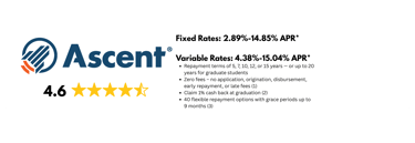 *Ascent’s undergraduate and graduate student loans are funded by Bank of Lake Mills or DR Bank, each Member FDIC. Loan products may not be available in certain jurisdictions. Certain restrictions, limitations, terms and conditions may apply for Ascent's Terms and Conditions please visit: AscentFunding.com/Ts&Cs. Annual Percentage Rates (APRs) displayed above are effective as of 10/1/2025 and reflect an Automatic Payment Discount of 0.25% on credit-based college student loans submitted prior to 6/1/2025, a 0.5% discount for on credit-based college student loans submitted on or after 6/1/2025 and a 1.00% discount on outcomes-based loans when you enroll in automatic payments. Loans subject to individual approval, restrictions and conditions apply. Loan features and information advertised are intended for college student loans and are subject to change at any time. For more information, see repayment examples or review the Ascent Student Loans Terms and Conditions. The final amount approved depends on the borrower’s credit history, verifiable cost of attendance as certified by an eligible school and is subject to credit approval and verification of application information. Lowest interest rates require full principal and interest (Immediate) payments, the shortest loan term, a cosigner, and are only available for our most creditworthy applicants and cosigners with the highest average credit scores. Actual APR offered may be higher or lower than the examples above, based on the amount of time you spend in school and any grace period you have before repayment begins.