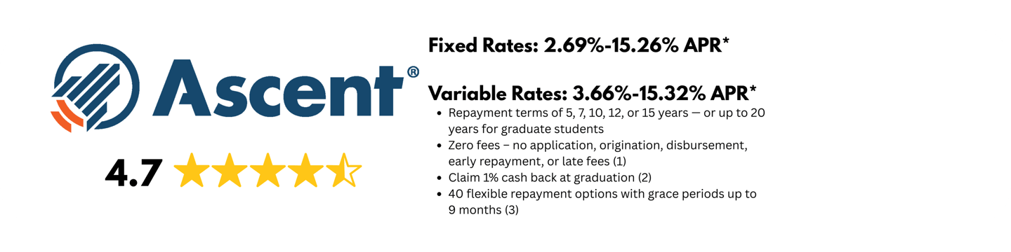 *Ascent’s undergraduate and graduate student loans are funded by Bank of Lake Mills or DR Bank, each Member FDIC. Loan products may not be available in certain jurisdictions. Certain restrictions, limitations, terms and conditions may apply for Ascent's Terms and Conditions please visit: AscentFunding.com/Ts&Cs. Annual Percentage Rates (APRs) displayed above are effective as of 3/1/2026 and reflect an Automatic Payment Discount of 0.25% on credit-based college student loans submitted prior to 6/1/2025, a 0.5% discount for on credit-based college student loans submitted on or after 6/1/2025 and a 1.00% discount on outcomes-based loans when you enroll in automatic payments. Loans subject to individual approval, restrictions and conditions apply. Loan features and information advertised are intended for college student loans and are subject to change at any time. For more information, see repayment examples or review the Ascent Student Loans Terms and Conditions. The final amount approved depends on the borrower’s credit history, verifiable cost of attendance as certified by an eligible school and is subject to credit approval and verification of application information. Lowest interest rates require full principal and interest (Immediate) payments, the shortest loan term, a cosigner, and are only available for our most creditworthy applicants and cosigners with the highest average credit scores. Actual APR offered may be higher or lower than the examples above, based on the amount of time you spend in school and any grace period you have before repayment begins.