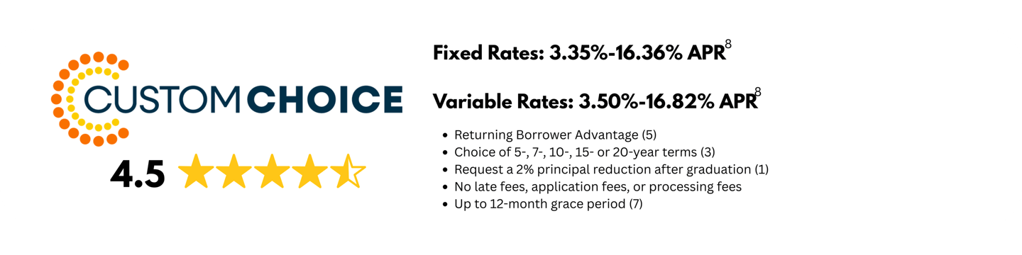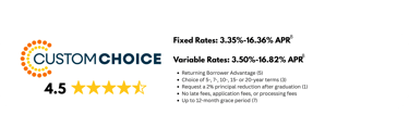 6 Interest rates and APRs (Annual Percentage Rates): Interest rates and APRs (Annual Percentage Rates) depend upon (1) the student’s and cosigner’s (if applicable) credit histories, (2) the repayment option and repayment term selected, (3) the expected number of years in deferment, (4) the requested loan amount and (5) other information provided on the online loan application. Rates and terms are effective as of 03/10/2026. The variable interest rate for each calendar month is calculated by adding the 30-Day Average Secured Overnight Financing Rate (“SOFR”) index, plus a fixed margin assigned to each loan. The current SOFR index, published on the website of the Federal Reserve Bank of New York, is 3.750% as of 03/10/2026. The applicable index or margin for variable rate loans may change over time and result in a different APR than shown. The fixed rate assigned to a loan will never change except as required by law or if you request and qualify for an interest rate discount or receive In-School Default Protection (see footnote #1 for details). APRs displayed as a range: APRs assume a $10,000 loan with one disbursement. The high APRs assume a 5-year term with the Interest-Only Repayment option, a 31-month deferment period, and a six-month grace period before entering repayment. The low APRs assume a 7-year term, and the Interest-Only Repayment option with payments beginning 30-60 days after the disbursement via auto pay (see footnote #9 for details).