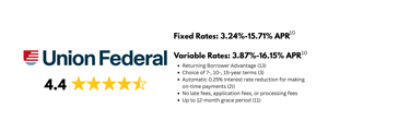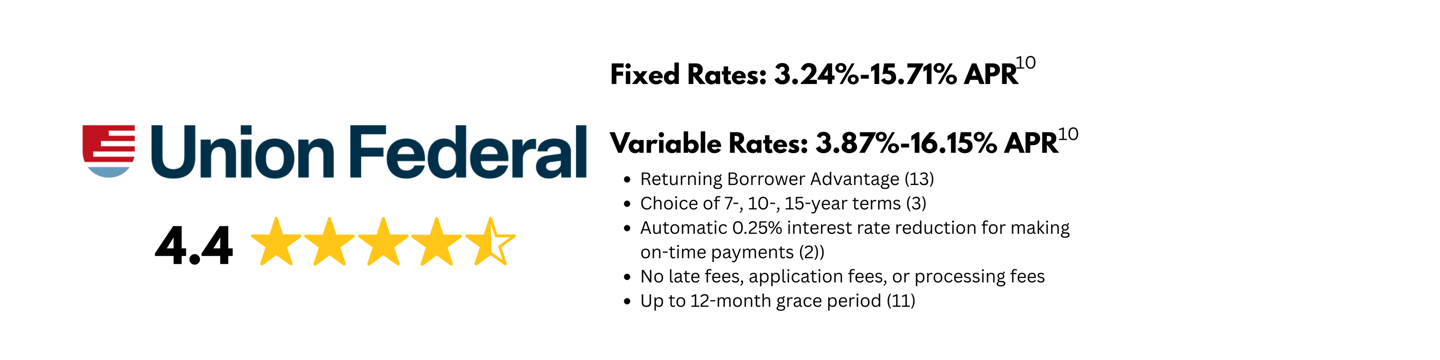 The Union Federal® Private Student Loan is made by Citizens (“Lender”). All loans are subject to individual approval and adherence to Lender’s underwriting guidelines. Program restrictions and other terms and conditions apply. LENDER AND MONOGRAM LLC EACH RESERVES THE RIGHT TO MODIFY OR DISCONTINUE PRODUCTS AND BENEFITS AT ANY TIME WITHOUT NOTICE. TERMS, CONDITIONS AND RATES ARE SUBJECT TO CHANGE AT ANY TIME WITHOUT NOTICE.