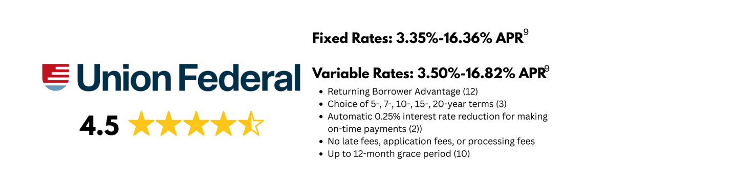 The Union Federal® Private Student Loan is made by DR Bank, member FDIC (“Lender”). All loans are subject to individual approval and adherence to Lender’s underwriting guidelines. Program restrictions and other terms and conditions apply. LENDER AND MONOGRAM LLC EACH RESERVES THE RIGHT TO MODIFY OR DISCONTINUE PRODUCTS AND BENEFITS AT ANY TIME WITHOUT NOTICE. TERMS, CONDITIONS AND RATES ARE SUBJECT TO CHANGE AT ANY TIME WITHOUT NOTICE.