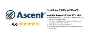 *Ascent’s undergraduate and graduate student loans are funded by Bank of Lake Mills or DR Bank, each Member FDIC. Loan products may not be available in certain jurisdictions. Certain restrictions, limitations, terms and conditions may apply for Ascent's Terms and Conditions please visit: AscentFunding.com/Ts&Cs. Annual Percentage Rates (APRs) displayed above are effective as of 12/1/2025 and reflect an Automatic Payment Discount of 0.25% on credit-based college student loans submitted prior to 6/1/2025, a 0.5% discount for on credit-based college student loans submitted on or after 6/1/2025 and a 1.00% discount on outcomes-based loans when you enroll in automatic payments. Loans subject to individual approval, restrictions and conditions apply. Loan features and information advertised are intended for college student loans and are subject to change at any time. For more information, see repayment examples or review the Ascent Student Loans Terms and Conditions. The final amount approved depends on the borrower’s credit history, verifiable cost of attendance as certified by an eligible school and is subject to credit approval and verification of application information. Lowest interest rates require full principal and interest (Immediate) payments, the shortest loan term, a cosigner, and are only available for our most creditworthy applicants and cosigners with the highest average credit scores. Actual APR offered may be higher or lower than the examples above, based on the amount of time you spend in school and any grace period you have before repayment begins.