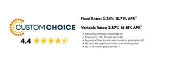 7) Interest rates and APRs (Annual Percentage Rates): Interest rates and APRs (Annual Percentage Rates) depend upon (1) the student’s and cosigner’s (if applicable) credit histories, (2) the repayment option and repayment term selected, (3) the expected number of years in deferment, (4) the requested loan amount and (5) other information provided on the online loan application. If approved, applicants will be notified of the rate applicable to your loan. Rates and terms are effective as of 12/1/2025. The variable interest rate for each calendar month is calculated by adding the 30-Day Average Secured Overnight Financing Rate (“SOFR”) index, or a replacement index if the SOFR index is no longer available, plus a fixed margin assigned to each loan. The SOFR index is published on the website of the Federal Reserve Bank of New York. The current SOFR index is 4.000% as of 12/1/2025. The variable interest rate will change if the SOFR index changes or if a new index is chosen or if you automatically qualify for In-School Default Protection (see footnote #1 for details). The applicable index or margin for variable rate loans may change over time and result in a different APR than shown. The fixed rate assigned to a loan will never change except as required by law or if you request and qualify for the on-time payment discount or auto pay discount or automatically qualify for In-School Default Protection (see footnote #1 for details). APRs displayed as a range: APRs assume a $10,000 loan with one disbursement. The high APRs assume a 5-year term with the Interest-Only Repayment option, a 31-month deferment period, and a six-month grace period before entering repayment. The low APRs assume a 7-year term, and the Immediate Repayment option with payments beginning 30-60 days after the disbursement via auto pay (see footnote #9 for details).