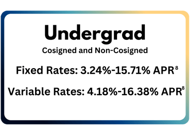 (8) Interest rates and APRs (Annual Percentage Rates) depend upon (1) the student’s and cosigner’s (if applicable) credit histories, (2) the repayment option and repayment term selected, (3) the expected number of years in deferment, (4) the requested loan amount and (5) other information provided on the online loan application. If approved, applicants will be notified of the rate applicable to your loan. Rates and terms are effective as of 10/1/25. The variable interest rate for each calendar month is calculated by adding the 30-Day Average Secured Overnight Financing Rate (“SOFR”) index, or a replacement index if the SOFR index is no longer available, plus a fixed margin assigned to each loan. The SOFR index is published on the website of the Federal Reserve Bank of New York. The current SOFR index is 4.34% as of 10/1/25. The variable interest rate will change if the SOFR index changes or if a new index is chosen. The applicable index or margin for variable rate loans may change over time and result in a different APR than shown. The fixed rate assigned to a loan will never change except as required by law or if you request and qualify for the auto pay discount (see footnote 2 above). APRs assume a $10,000 loan with one disbursement. The low APRs assume a 7-year term, and the Immediate Repayment option with payments beginning 30-60 days after the disbursement via auto pay. See footnote 2 for auto pay details.