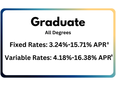 Custom Choice offers graduate loans for nearly all degree types, with comparable interest rates and a well-rounded array of borrower benefits. Customization is key, with four repayment options and three loan terms (7-, 10-, and 15-years) to choose from (3). You can request a 2% graduation reward (1) and get a 0.25% interest rate reduction when you elect auto pay (2).
