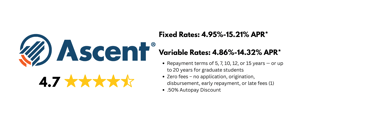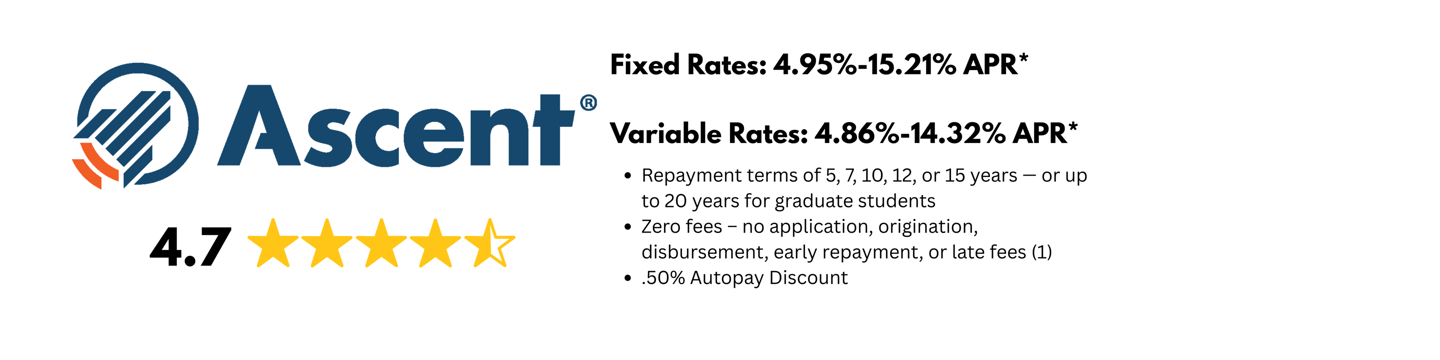 *Ascent’s undergraduate and graduate student loans are funded by Bank of Lake Mills or DR Bank, each Member FDIC. Loan products may not be available in certain jurisdictions. Certain restrictions, limitations, terms and conditions may apply for Ascent's Terms and Conditions please visit: AscentFunding.com/Ts&Cs. Annual Percentage Rates (APRs) displayed above are effective as of 3/1/2026 and reflect an Automatic Payment Discount of 0.25% on credit-based college student loans submitted prior to 6/1/2025, a 0.5% discount for on credit-based college student loans submitted on or after 6/1/2025 and a 1.00% discount on outcomes-based loans when you enroll in automatic payments. Loans subject to individual approval, restrictions and conditions apply. Loan features and information advertised are intended for college student loans and are subject to change at any time. For more information, see repayment examples or review the Ascent Student Loans Terms and Conditions. The final amount approved depends on the borrower’s credit history, verifiable cost of attendance as certified by an eligible school and is subject to credit approval and verification of application information. Lowest interest rates require full principal and interest (Immediate) payments, the shortest loan term, a cosigner, and are only available for our most creditworthy applicants and cosigners with the highest average credit scores. Actual APR offered may be higher or lower than the examples above, based on the amount of time you spend in school and any grace period you have before repayment begins.