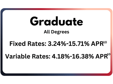 Union Federal offers graduate loans for nearly all degree types, with comparable interest rates and a well-rounded array of borrower benefits. Customization is key, with four repayment options (3) and three repayment terms (7-, 10-, and 15-years) to choose from (3). You can receive an automatic 0.25% interest rate reduction for making on-time payments (2) and an additional 0.25% interest rate reduction when you elect auto pay (1).