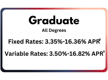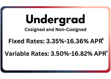 (9) Interest rates and APRs (Annual Percentage Rates) depend upon (1) the student’s and cosigner’s (if applicable) credit histories, (2) the repayment option and repayment term selected, (3) the expected number of years in deferment, (4) the requested loan amount and (5) other information provided on the online loan application Rates and terms are effective as of 3/10/26.The variable interest rate for each calendar month is calculated by adding the 30-Day Average Secured Overnight Financing Rate (“SOFR”) index plus a fixed margin assigned to each loan. The current SOFR index, published on the website of the Federal Reserve Bank of New York, is 3.750% as of 3/10/26. The applicable index or margin for variable rate loans may change over time and result in a different APR than shown. The fixed rate assigned to a loan will never change except as required by law or if you request and qualify for an interest rate discount or receive In-School Default Protection (see footnote #14 for details). APRs assume a $10,000 loan with one disbursement. The high APRs assume a 5-year term with the Interest-Only Repayment option, a 31-month deferment period, and a six-month grace period before entering repayment. The low APRs assume a 7-year term, and the Interest-Only option with payments beginning 30-60 days after the disbursement via auto pay. See footnote 1 for auto pay details.