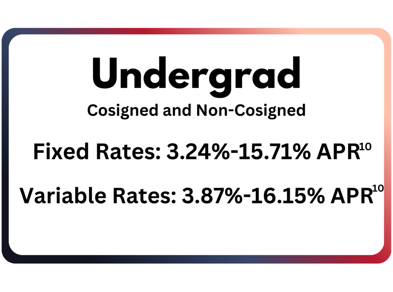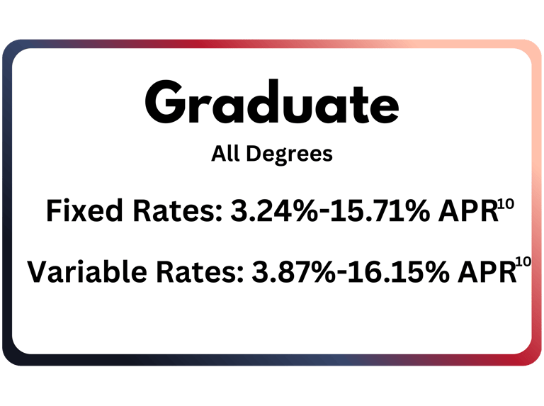 (10) Interest rates and APRs (Annual Percentage Rates) depend upon (1) the student’s and cosigner’s (if applicable) credit histories, (2) the repayment option and repayment term selected, (3) the expected number of years in deferment, (4) the requested loan amount and (5) other information provided on the online loan application. If approved, applicants will be notified of the rate applicable to your loan. Rates and terms are effective as of 12/1/25. The lowest APRs assume a $10,000 loan with one disbursement, a 7-year term, and the Immediate Repayment option with payments beginning 30-60 days after the disbursement via auto pay (see footnote 1 above). The variable interest rate for each calendar month is calculated by adding the 30-Day Average Secured Overnight Financing Rate (“SOFR”) index, or a replacement index if the SOFR index is no longer available, plus a fixed margin assigned to each loan. The SOFR index is published on the website of the Federal Reserve Bank of New York. The current SOFR index is 4.000% as of 12/1/25. The variable interest rate will change if the SOFR index changes or if a new index is chosen. The applicable index or margin for variable rate loans may change over time and result in a different APR than shown. The fixed rate assigned to a loan will never change except as required by law or if you request and qualify for the auto pay discount (see footnote 1 above).